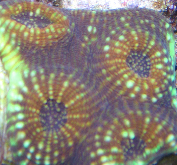 have thick orange ridges. Rows of Bright Lime Green Pigment Spots Radiate Outward from the Corallite