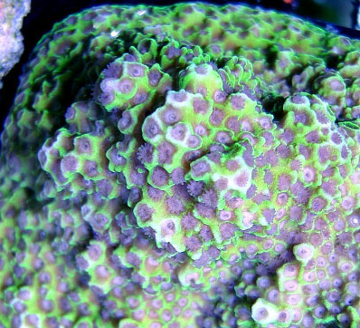 This rare Montipora foveolata species has a bright lime green base coloration. Its polyps