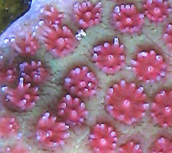 When we acquired our original small fragment, the base of the coral was light blue in coloration. This color has morphed to a light green base with the edges of the coral being pigmented blue. The main exotic attraction of this coral however, is the unique bright pink red polyps that extend during the daytime photoperiod. The polyp mouths are bright pink, while the tips of the tentacles are a bright whitish pink. Overall the polyps have a deep Pink/Red pigmentation (see closeup image below).