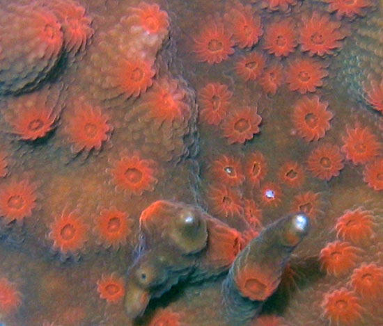 Blood Red Eyes Cyphastrea Reeffarmers Seed Closeup. Note intensely colored corallites. |