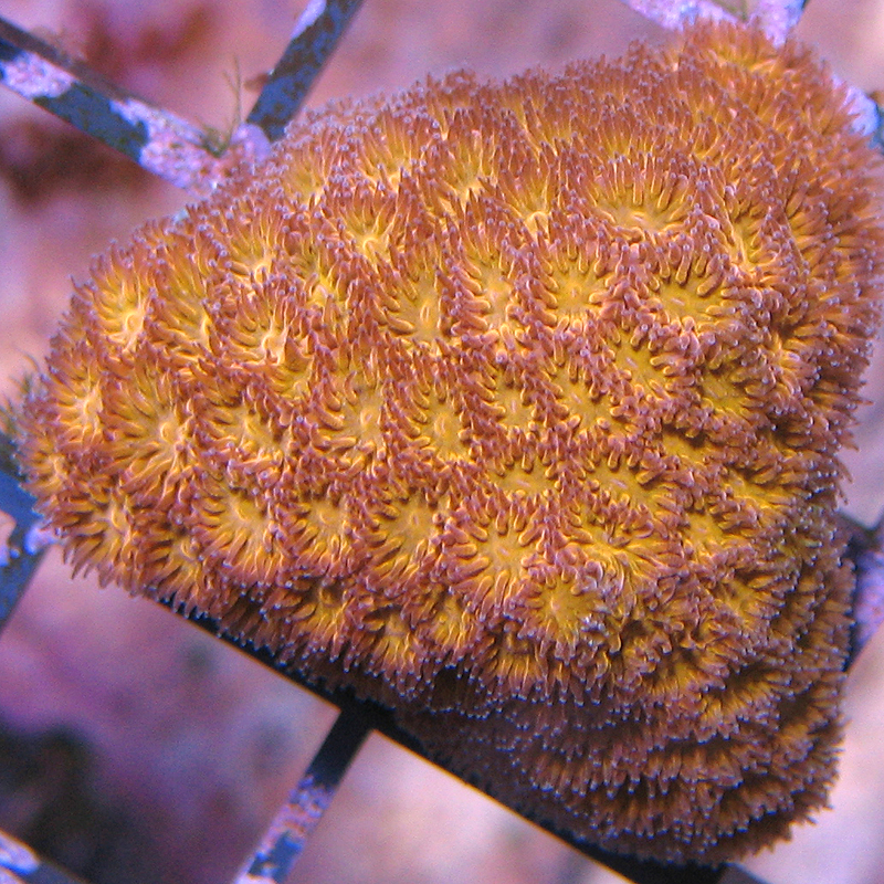 unusual gold pigmentation that is brighter in corallite centers and at the base of polyp tentacles