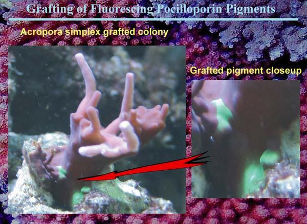Update August 18th 2009 - Please note that we suspended fragment shipments during the summer of 2006. What happened was that the base of the colony was covered with Bryopsis algae and the base was killed off before we had the time to notice the problem. There had been three reservations harvested. One of those went to Clint Conway. There is currently only one known surviving fragment of the Grafted Simplex #1. Mike Poletti of Sacramento is the only one with this version and he had acquired a fragment from Clint Conway. Reeffarmers was able to salvage a large branch of the original colony, but it lacked any grafted spots. We let this branch grow for well over a year into a small colony. Then when we got time to revisit this experimental coral, we attempted grafting #2. We used a fluorescent green Pocillopora damicornis and managed to succesfully transfer pigments using the forced contact grafting technique. These grafted spot areas were purchased by World Wide Corals since we wanted to establish a version of this coral on the east coast. WWC has the only spots from Grafting #2. We then proceeded to do grafting #3 with the same green Pocillopora damicornis and it was successful. We now have a medium sized colony with about 4 different green grafted pigment spots. We will be growing and harvesting Grafted Simplex #3 and shipping those for the reservations on this web page. We will add images of grafting #2 and grafting #3 when we get time over the next few months.