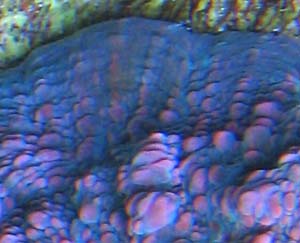 Note lesser amounts of red pigmentation. More line patterns to red. Polyp mouths are very apparent and have orangish pigmentation.