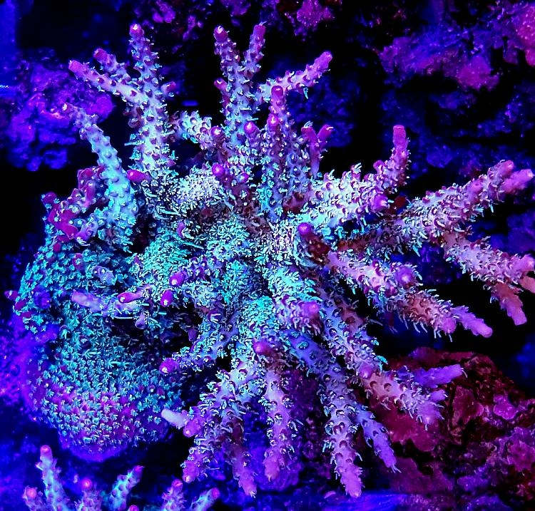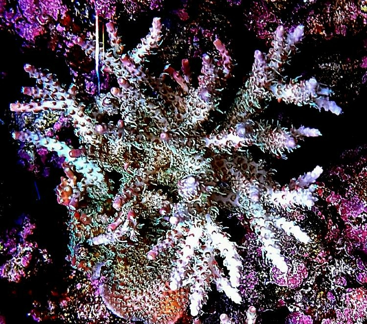 The LOA Pinky in the Pub was named by Dennis Sandoval of Law Office Aquariums. The coral appears to be a morph similar to Pinky the Bear, but has some interesting distinctions. The extended mint green tentacle is why it was named Pinky in the Pub. The hairy green tentacle represents an Irish pub. Dennis acquired the coral in 2015 as a small seed consisting of brown sticks. It morphed to a white branch with elongated whitish polyp. Then it developed a white beige body with bright red polyps. The elongated tentacle was white. The coral has stabalized for a few months as the white extended tentacle developed a mint green coloration. Reeffarmers acquired our seed section directly from Law Office Aquariums who shipped a seed fragment direct to our shop in Texas.