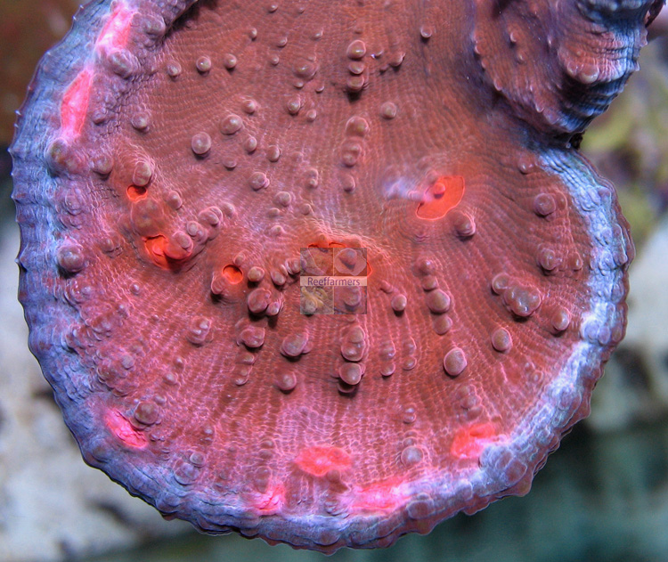 maintains its pigmentation intensity. Corallites near the edge are bright pink while older corallites