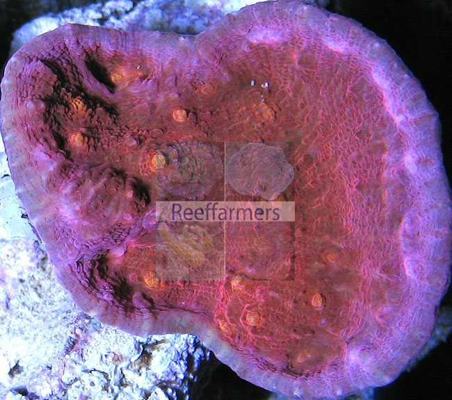 Rainbow Delight Oxypora corallite closeup image. Note the orange yellow |