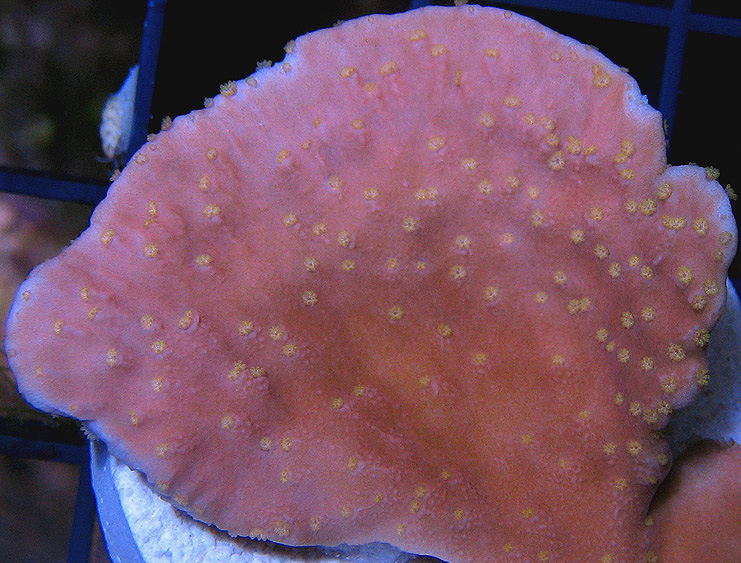 Since we first listed this coral we have been contacted about two other versions of this color morph of Montipora cap. Chuck Goodman of Reef-Tech.net has a similar Montipora he originally acquired from Zack Wilson. We will list any other orange/red Montipora caps with golden yellow colored polyps that we learn about.