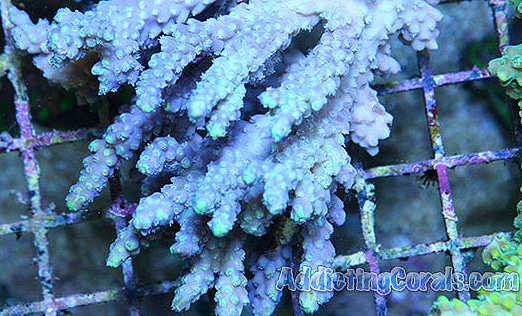 Steve Tyree is maintaining a seed section of this coral for Reeffarmers.com in a 130 gallon Raceway Gyre BiZonal system. This system is naturally filtered with a semi-cryptic zone and a reef flat exposed zone. In Steve's captive reef the coral is positioned to receive strong light levels from a 400 watt 20,000 K Radium metal halide. The first edition fragment of this coral was sold privately. Introductory price was $125 for a small single branching first edition fragment.