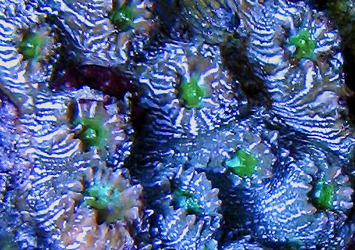 has exotic blue white stripes over its main surface. Corallite centers are solid deep green colored.