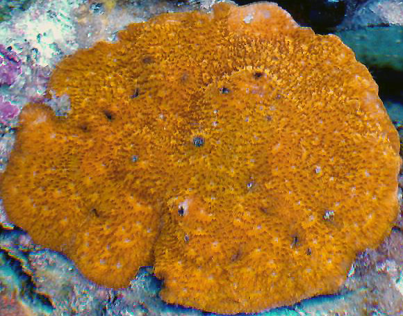 This Leptoseris-like coral has a brilliant solid orange pigmentation. It grows a thick