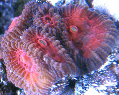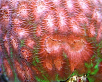 Reeffarmers acquired a seed section of this coral from the Southern California reef aquarists who acquired the one distributed fragment. That reef aquarist had grown two seed sections of the coral from the two Favia polyps distributed from Diamonds in the Reef before they sold the original colony. The seed sections were grown and maintained under low light levels where the dark red pigments appeared to develop more intensely. We believe that the lighter pink corallite centers and green leading edges will develop if fragments of this coral are maintained in moderate to strong light levels. The growth of the seed sections of this coral demonstrate that the coral can grow and thrive within a captive reef systems.