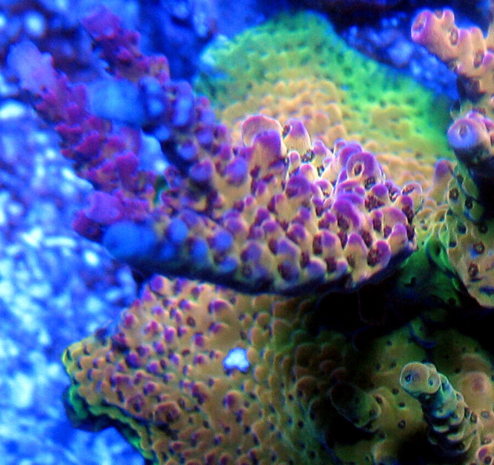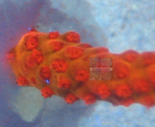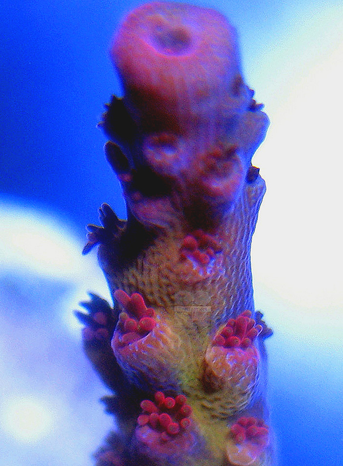 Steve Tyree is maintaining a seed section of this coral for Reeffarmers within a 7 foot Raceway Gyre BiZonal system. This system is naturally filtered with a semi-cryptic zone and a reef flat exposed zone. In Steve's captive reef the coral is positioned to receive moderate to weak light levels from a 400 watt 20,000 K Radium metal halide. Rit from Atlanta Aquarium discovered that when exposed to strong light halides at his house, the coral was primarily brown with little color. After bringing the coral to his reef shop and exposing the Acropora to LED lighting, its amazing pigmentation patterns began to develop. According to Rit, higher LED intensity will develop greater golden yellow surface pigmentation. The first edition fragment of this coral was sold through Facebook. List price was $350.00 and a volume discount of 20 % was applied so actual payment was $280.00 . Reeffarmers is also selling a couple of Drop Shipped small fragments that are the 3rd, 4th and 5th editions. Those are available now. Email for details. We are also healing up a small tiny harvest frag that is the 2nd edition. Page text updated on April 24th 2016.