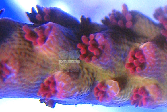 This coral was originally acquired by Rit of the Atlanta Aquarium around the 2008 timeframe. Its was just a small hitchhiking coral that had survived on a piece of Indonesia rock base. Rit salvaged the coral and grew it out for about 8 years in captivity. Although many regular customers had asked about the coral, Rit refused to make any fragments. Than in May 2015, Rit was visited by a group of vendors. Three fragments were harvested at that time, but only one survived. The fragment IJAM acquired survived and was given to Jason Fox Signature Corals. Then in April 2016, Reeffarmers visited the Atlanta Aquarium and Rit was ready to distribute more fragments. He had also developed the corals marketing name. Reeffarmers decided this unique coral should be an Exclusive Edition due to its unique qualities and the manner in which Rit had acquired the coral.