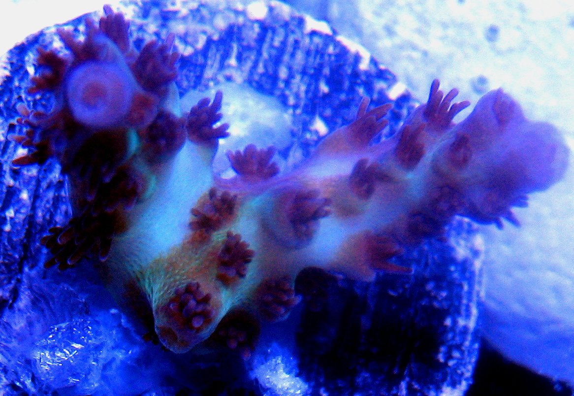 Steve Tyree is maintaining a seed section of this coral for Reeffarmers.com in a 8 foot Raceway Gyre BiZonal system. This system is naturally filtered with a semi-cryptic zone and a reef flat exposed zone. In Steve's captive reef the coral is positioned to receive moderate light levels from a 400 watt 20,000 K Radium metal halide. The first edition fragment of this coral is now being offered to public buyers (see actual image below). List price is $200.00 . Reeffarmers standard max discount of 20 % brings that down to a maximum discounted price of $160 from the $200 Buy It Now.