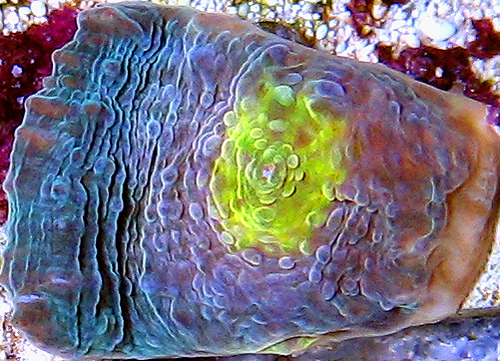 Steve Tyree is maintaining a seed section of this coral for Reeffarmers.com in a 130 gallon Raceway Gyre BiZonal system. This system is naturally filtered with a semi-cryptic zone and a reef flat exposed zone. In Steve's captive reef the coral is positioned to receive moderate light levels from a 400 watt 20,000 K Radium metal halide. The price of this coral per small fragment consisting of a single polyp will be determined by the first edition auction below.