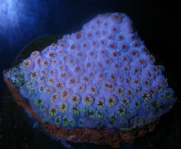 We acquired our seed fragment for this coral in early September 2016 directly from Garrett's Acropolis. Steve Garrett believes this is the same Rainbow Cyphastrea morph that has been sold as a mid to high range coral within the captive reef market. It clearly has rainbow pigmentation patterns even under 20,000 K lighting. Garrett acquired the coral from Jose Serrano who had acquired his coral from Jw.