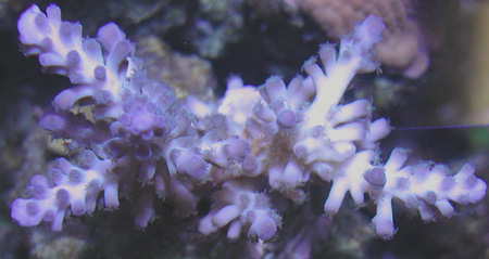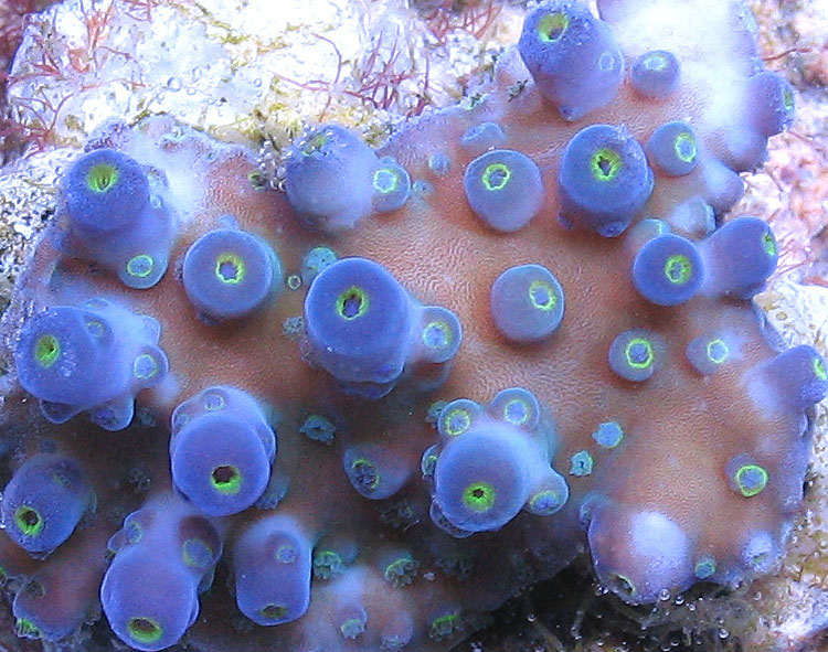 Blue Sceptor Acropora echinata Fragment Image. Note the green rings around the corallites and the partially extended blue colored polyps in the lower center area. |