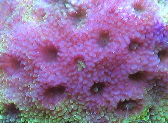 Astreopora sp. Fiji Purple Blue Photo September 2008while the main body is bright purple pink. The leading growth edge is also bright green. Image Copyright © 2008 by Reeffarmers All Rights Reserved. |