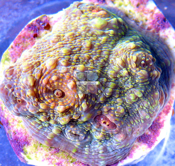 Steve Tyree is maintaining a seed section of this coral for Reeffarmers.com in a 130 gallon Raceway Gyre BiZonal system. This system is naturally filtered with a semi-cryptic zone and a reef flat exposed zone. In Steve's captive reef the coral is positioned to receive weak to moderate light levels from a 400 watt 20,000 K Radium metal halide. The first edition fragment of this coral was auctioned at the 2011 SE-CFM coral show. Reeffarmers sold the second edition for $125.00 on June 22nd 2011 to private collector James Wensil.