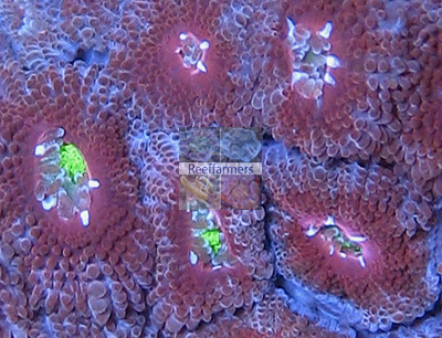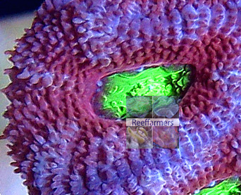 The Blue Meanie Micromussa has bright green corallite centers. The inner corallite ridge is colored dark red. This pigment changes to a violet blue in the outer corallite ridge area. We believe that Miguel called it the Blue Meanie because the blue area was larger and the inner dark red area was smaller. So the Meanie part must be the inner dark red. See corallite closeup image below. While Frank McDonald adapted this coral fully to captivity he was feeding it frozen Mysis shrimp. The dark red pigment seems to have increased its density.