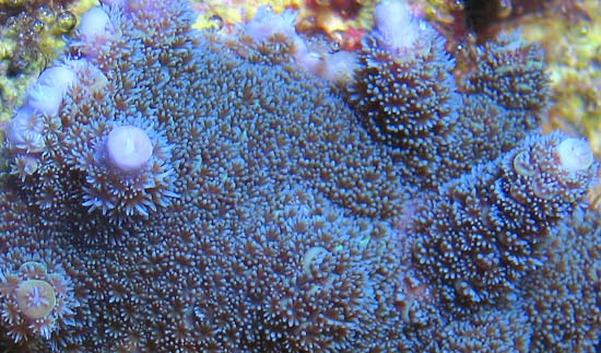 very fleshy and shaggy polyp tentacles. Polyps are colored bright blue