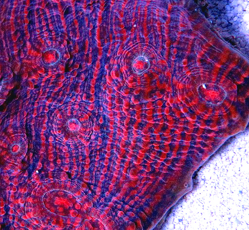 Reeffarmers acquired our seed fragment from KLR/Kelby in the spring of 2011. It was originally purchased from an online retailer in the early winter of 2010. The retailer claimed the coral was an Australian export. Kelby and his reef buddy Austin (clowns101) came up with the name Criminal Minds. The coral is now known by that name throughout the reef market. Kelby states that the coral will do fine under high light, but it will develop thicker and brighter red lines when exposed to moderate and low lighting. This chalice does well in captivity and is a quick grower.