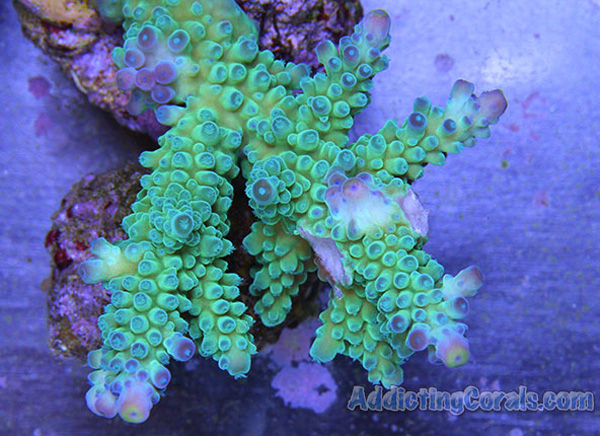 We do not know the exact species of the Crown Jewels Acropora. It is similar to Tortuosa and Gomezi, but radial corallites are uniform in size and densely packed. We currently believe that it might be a hybrid. The Crown Jewels Acropora was actually an aquacultured piece that has only rarely been imported. Nick at Addicting Corals has seen two imported and he bought both. One was acquired in February while the other was acquired in April. Nick states that this coral will do best in strong flow and medium light levels.