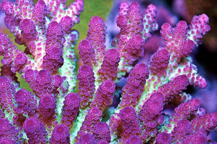 Steve Tyree of Reeffarmers remembers seeing fragments of this species and morph of Acropora way back in the Mid-1990's. Back then they were being exported through Dave Palmer in the Solomon Islands. We acquired our new seed and first edition fragments directly from WT Inc.. Dan and Tina of Wet Thumbs acquired their incredible new colony around April of 2011. It was exported from the Solomon Islands and was found in a shallow water lagoon. They recommend strong light and moderate to strong water curent. They state the coral has been fragmenting and encrusting quickly. They recommend a low nutrient system. Also it is possible that pottasium and iodine additives might help to develop pigments.