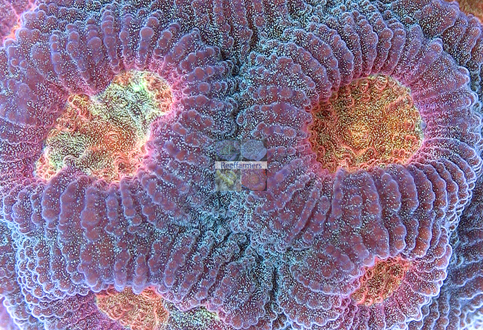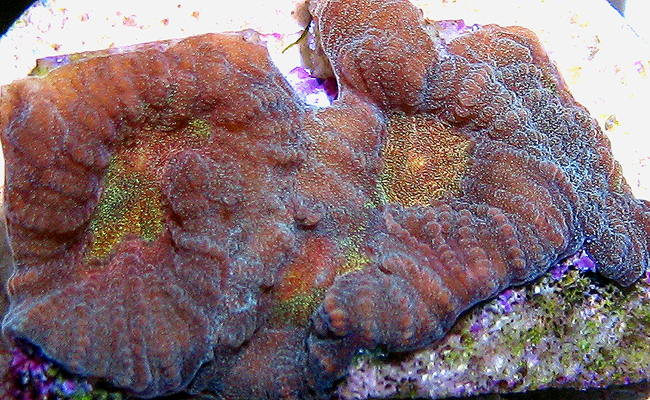 The First Wonder Favia was originally found by Jay (sps4mytank) and Sanh (lowbudget). They discovered the coral on display at the retail reef shop Tong's located in Fountain Valley Southern California. They both split the original colony into two seed sections. Jay and Sanh believe this coral requires moderate to weak water current. They also recommend low to weak light levels. This Favia also apparently grows fairly well in captivity.