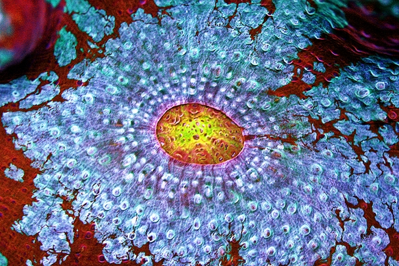 The Gamma Ray Chalice was exported from Australia and acquired by Wet Thumb Frags during the early summer of 2011. The delicate patterns within the corallite and the radiating patterns around the corallite appear somewhat similar to high energy sub-atomic particles and gamma ray decays. Thus the name Gamma Ray Chalice was coined by Wet Thumb Frags. Dan and Tina recommend moderate to low light levels along with moderate water flow rates. This chalice can be difficult to fragment and it requires some super glue bandages along the cut line.