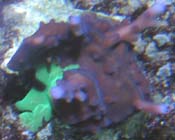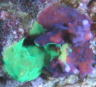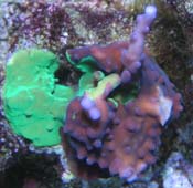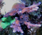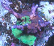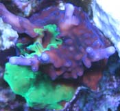 Update August 18th 2009 - Please note that we suspended fragment shipments during the summer of 2006. What happened was that the base of the colony was covered with Bryopsis algae and the base was killed off before we had the time to notice the problem. There had been three reservations harvested. One of those went to Clint Conway. There is currently only one known surviving fragment of the Grafted Simplex #1. Mike Poletti of Sacramento is the only one with this version and he had acquired a fragment from Clint Conway. Reeffarmers was able to salvage a large branch of the original colony, but it lacked any grafted spots. We let this branch grow for well over a year into a small colony. Then when we got time to revisit this experimental coral, we attempted grafting #2. We used a fluorescent green Pocillopora damicornis and managed to succesfully transfer pigments using the forced contact grafting technique. These grafted spot areas were purchased by World Wide Corals since we wanted to establish a version of this coral on the east coast. WWC has the only spots from Grafting #2. We then proceeded to do grafting #3 with the same green Pocillopora damicornis and it was successful. We now have a medium sized colony with about 4 different green grafted pigment spots. We will be growing and harvesting Grafted Simplex #3 and shipping those for the reservations on this web page. We will add images of grafting #2 and grafting #3 when we get time over the next few months.
