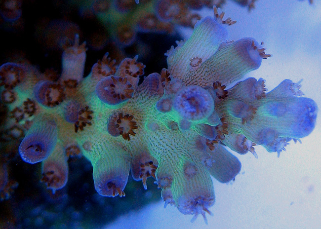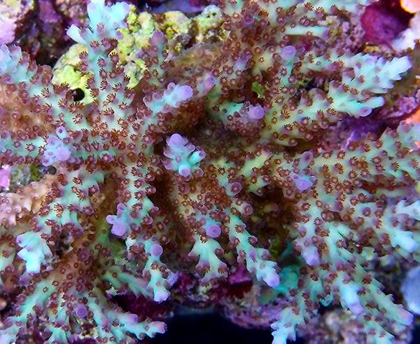 Julian's Rainbow Acropora is named after Julian Hechavarria from the Chicago area. Julian is the founder of Elegant Corals LLC. He acquired this coral about 10 years ago in Schaumburg Illinois. He purchased it as a Rainbow and he had thought all these years that it was Joe's Rainbow. Fairly obvious that this is not Joe's Rainbow. There is only one other person who had a fragment of this incredible Acropora at the time Reeffarmers received our first edition and seed. Julian says the coral is very hardy, but he has nearly lost it on at least one occassion during those years. Reeffarmers did a double dip on our initial fragments and we noticed the tips showed some stress so this coral may be a little sensitive to dips. We double dipped with Revive and then Iodine.