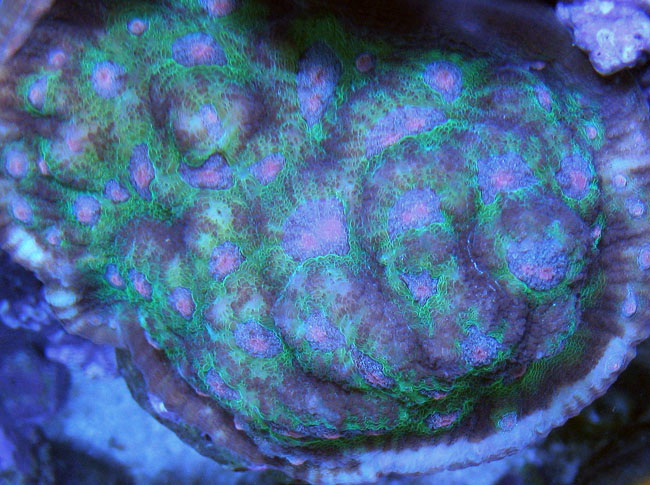 Incredible corallite pigmentation includes outer green rays, inner violet/blue center