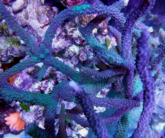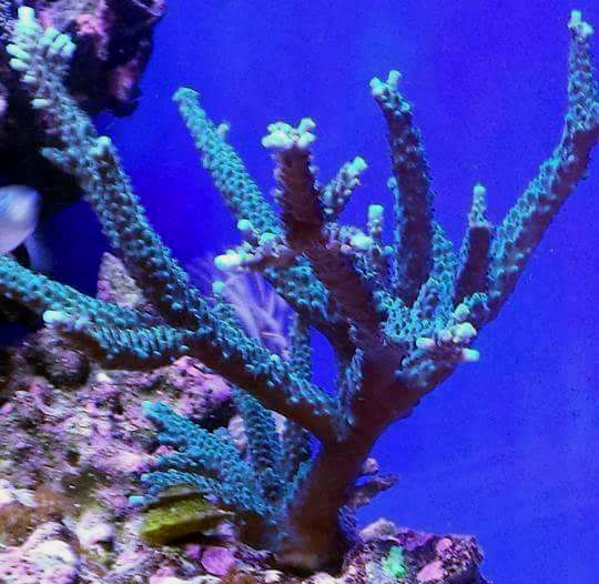 The second image below of this coral is actually a good representation for how the Samoan stags looked back then. There were really only two types of stags imported from Samoa. A thin branched stag (which we believe is this one) and a thicker branched stag. Reeffarmers can not definitively say this was or is a Samoan, but it does look very similar in this image. The last colony image below shows the more turquoise green coloration the staghorn can also develop. Reeffarmers received our seed fragment direct from Elegant Corals LLC and Cruz Arias.