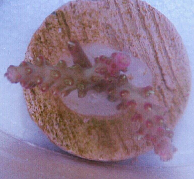 The LOA Pinky in the Pub was named by Dennis Sandoval of Law Office Aquariums. The coral appears to be a morph similar to Pinky the Bear, but has some interesting distinctions. The extended mint green tentacle is why it was named Pinky in the Pub. The hairy green tentacle represents an Irish pub. Dennis acquired the coral in 2015 as a small seed consisting of brown sticks. It morphed to a white branch with elongated whitish polyp. Then it developed a white beige body with bright red polyps. The elongated tentacle was white. The coral has stabalized for a few months as the white extended tentacle developed a mint green coloration. Reeffarmers acquired our seed section directly from Law Office Aquariums who shipped a seed fragment direct to our shop in Texas.