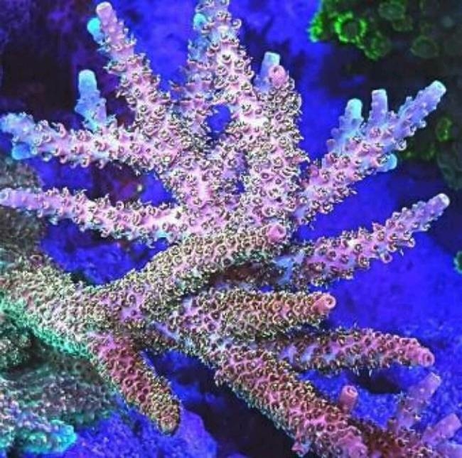 Richard's Rainbow Stag was named by Law Office Aquariums (LOA) after Richard Bausa. Richard is a long time associate of Dennis Sandoval and helps Dennis maintain the reef tanks at LOA. The original coral was acquired as a browned out stick in the spring of 2017. After being maintained within the LOA grow out reefs for 6 months, this browned out stick has developed into one of the most colorful staghorn Acropora in the captive market. Reeffarmers acquired our seed section directly from Law Office Aquariums who shipped a seed fragment direct to our shop in Texas.