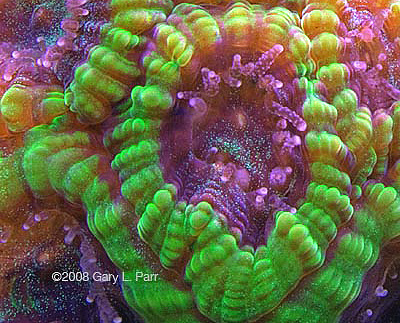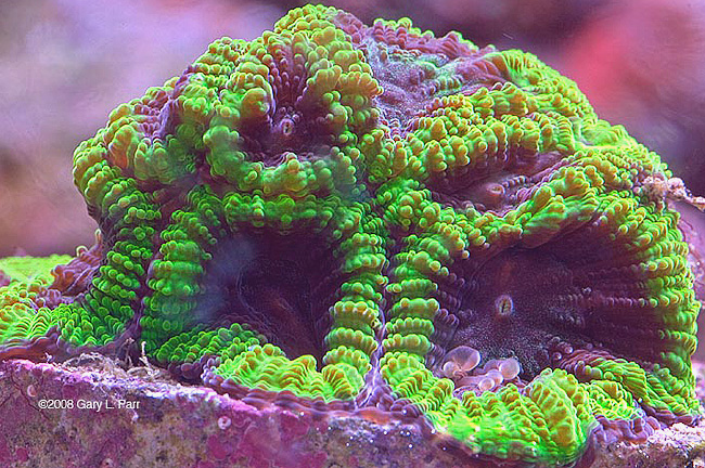 The Mystic Grape Favia has brilliant fluorescent green pigments that occur within thin outer rings