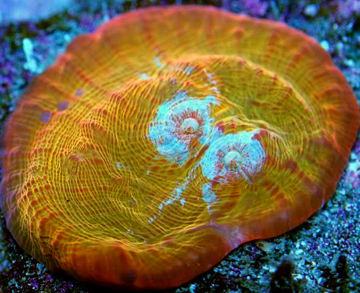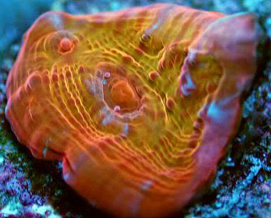Reeffarmers acquired our seed fragments directly from Morgan Wood of Captain's Corals. Morgan originally acquired this coral during the spring of 2009 from reef aquarist Gonewild34 (Reef2Reef). Fragments were distributed by Gonewild34 to Morgan and also Easton Reef. Unfortunately the original coral and Easton Reef's fragment were lost. Only Morgan of Captain's Corals managed to get a fragment to fully adapt and thrive within captivity. Morgan had been maintaining the Orangeaide Chalice under moderate T5 lighting, but switched over to LED lighting in July 2011. He recommends moderate water currents. This chalice has been a slow grower.