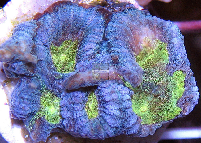 Reeffarmers acquired our seed section directly from Andy (spspirate) right at the end of 2011. Andy had purchased the coral directly from Chris at Reef Koi during the summer of 2010. Reef Koi transhipped the Pirates Booty Favia from Jakarta. It was originally a light blue favia with yellow/green corallites. After adapting to captivity, the coral developed very bright sky blue ridges with bright yellow green corallites. Andy claims the coral can also develop a fine pink rim around the yellow green corallite centers. We have seen that trait in other similarly colored Favia corals. According to Andy, when the golden yellow corallite pigments dominate, the golden yellow corallite center can appear similar to gold coins. Thus the coral was named Pirates Booty Favia.