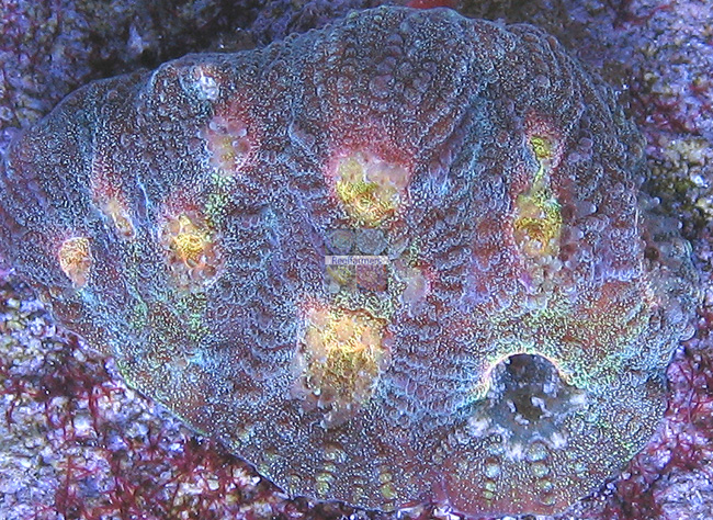 golden pigmentation. The coral has multi-colored pigment granuales located all over its surface. Around