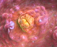 Rainbow Delight Oxypora corallite closeup image. Note the orange yellow |