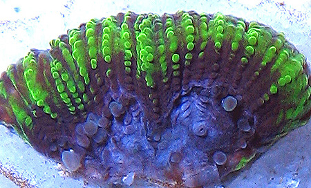 Steve Tyree is maintaining a seed section of this coral for Reeffarmers.com in a 130 gallon Raceway Gyre BiZonal system. This system is naturally filtered with a semi-cryptic zone and a reef flat exposed zone. In Steve's captive reef the coral is positioned to receive moderate to weak light levels from a 400 watt 20,000 K Radium metal halide. The price of this coral per small fragment consisting of a single polyp will be determined by the first edition auction below.