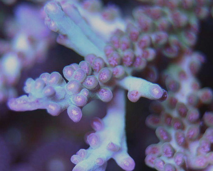 Justin Leoni of Reef Grow acquired the original RG Grapevine Acropora on October 1st of 2013 directly from Pacific Aqua Farms in Los Angeles. Originally the coral was brown, but slowly developed the unique turquoise branch stem pigmentation and the pink colored polyps. The coral was named by Justin at Reef Grow.