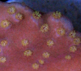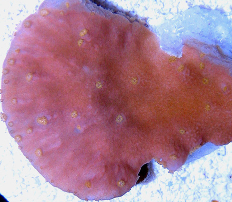 Since we first listed this coral we have been contacted about two other versions of this color morph of Montipora cap. Chuck Goodman of Reef-Tech.net has a similar Montipora he originally acquired from Zack Wilson. We will list any other orange/red Montipora caps with golden yellow colored polyps that we learn about.