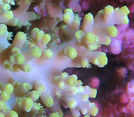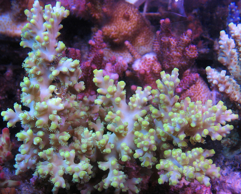 Reeffarmers acquired our new seed and first edition fragments directly from WT Inc.. Dan and Tina of Wet Thumbs originally transhipped this colony from Bali in early 2011. The name Sol Amarillo is spanish for Yellow Sun and was coined as a group effort by Art Petit, Steve Tyree, Dan and Tina. Wet Thumbs recommends strong light and they state the coral survives fragmentation very well. Under good conditions it is a very hardy coral.