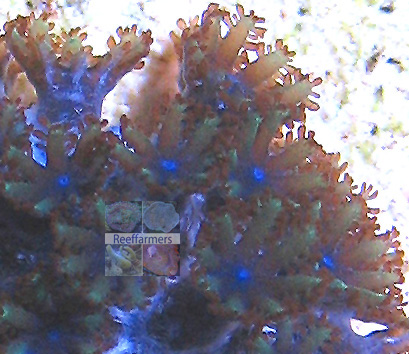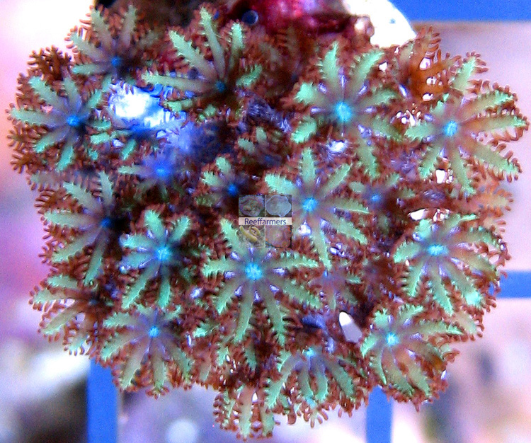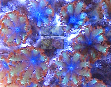 Reeffarmers has acquired two different seeds of this coral. Our first seed came from The Mystic Reef and they acquired the coral initially as a hitchhiker found on the base of a reef rock. The two closeup images below are of The Mystic Reef seed colony. After researching this coral we also discovered that Wet Thumb Frags had acquired a seed colony back in 2009. The top image above is of their seed. They have been selling cultured seeds when available. The last image below shows both colonies side by side and imaged with the same camera. They are almost identical. A slight difference in color can be seen in the polyp mouth area, but that may have been due to a difference in lighting that the seeds were grown under.