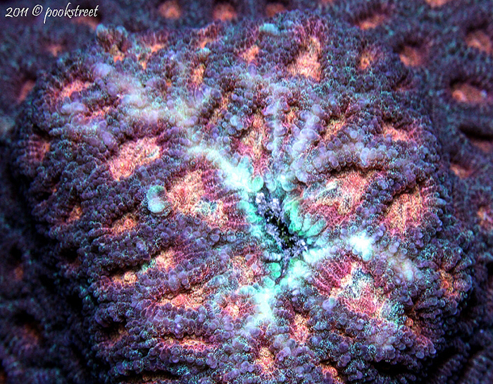 We originally acquired a fragment of this exotic Favia from Richard McKellip around the 2008 time frame. We intended to evaluate the coral for LE status, but fragments were sold quickly and we eventually lost the tiny seed. While attending the 2012 SW-CFM Coral Show in Southern California, we received a new seed section of this coral from Pookstreet. He had been maintaining the coral after also receiving a fragment from Richard McKellip.