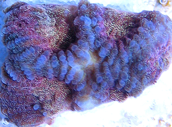 Reeffarmers is maintaining a seed section of this coral in a 8 foot Raceway Gyre BiZonal system. This system is naturally filtered with a semi-cryptic zone and a reef flat exposed zone. In this captive reef the coral is positioned to receive weak to moderate light levels from a 250 watt 20,000 K Radium metal halide. The first edition fragment of this coral was sold on our Buy It Now page. List price was $80 for a small fragment with 3 corallite eyes.