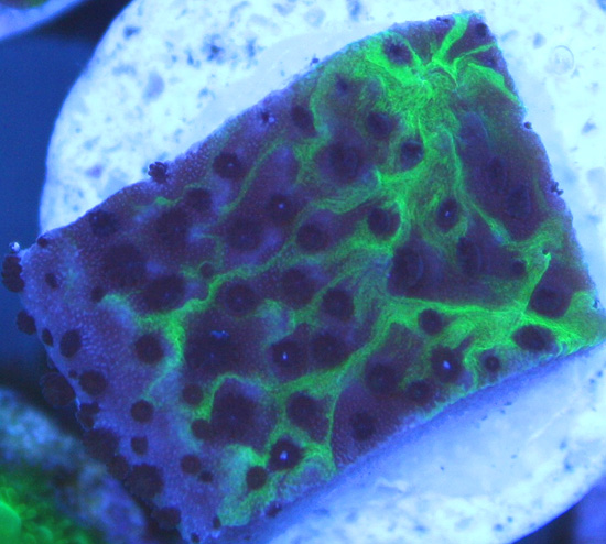 Steve Tyree is maintaining a seed section of this coral for Reeffarmers.com in a 130 gallon Raceway Gyre BiZonal system. This system is naturally filtered with a semi-cryptic zone and a reef flat exposed zone. In Steve's captive reef the coral is positioned to receive moderate to weak light levels from a 400 watt 20,000 K Radium metal halide. Water current is moderate. The first edition fragment was sold Buy It Now for $125.00