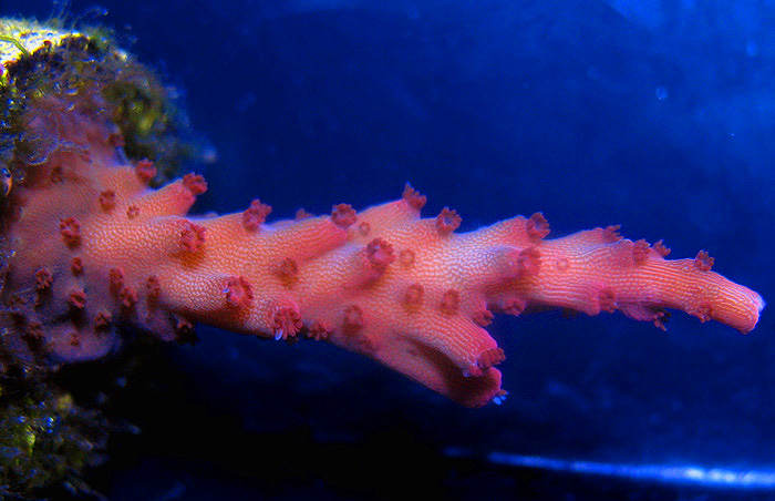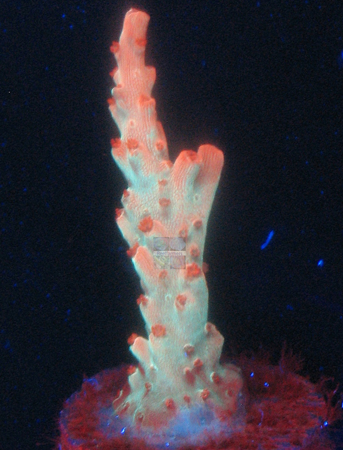 Reeffarmers is maintaining a seed section of this coral in a 8 foot Raceway Gyre BiZonal system. This system is naturally filtered with a semi-cryptic zone and a reef flat exposed zone. In this captive reef the coral is positioned to receive moderate light and moderate water current. The first edition fragment of this coral is being offered for sale and will be listed on Reeffarmers Buy it Now web page shortly. List price for the small fragment is $125. Reeffarmers is also growing out a fresh cut tiny second edition fragment. Please email for info. Page text updated on April 24th 2016.